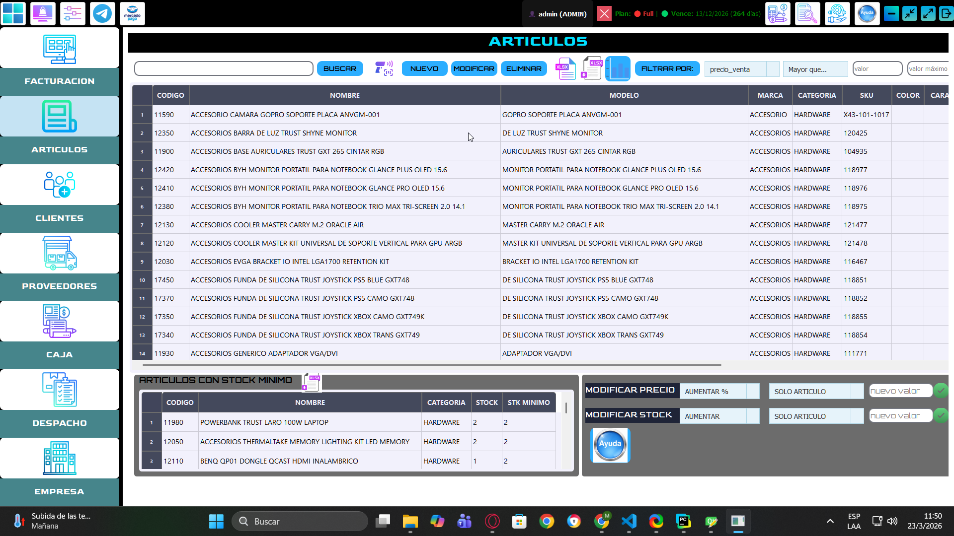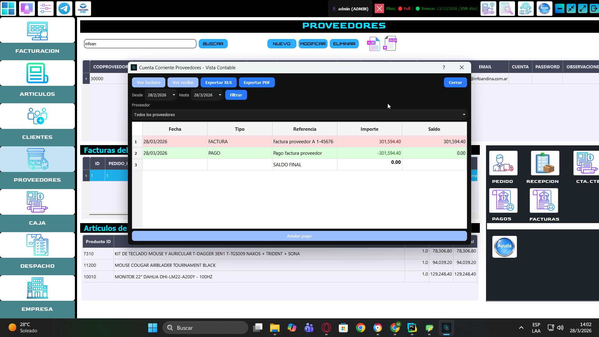 Pedidos, recepción con aumento automático de stock, facturas y cuenta corriente completa.